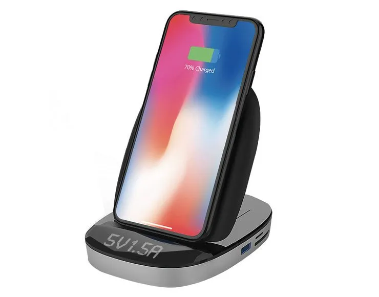 Lo stand di ricarica può essere posizionato in vari modi, cambiando l’angolo di visione e l’iPhone collocato verticalmente (utile per leggere le notifiche) o orizzontalmente. Un display LCD mostra il voltaggio della ricarica e altri dettagli. Il dispositivo supporta sia USB Quick Charge e USB-C Power Delivery in ingresso e permette l’aggiornamento del firmware con nuove funzionalità.