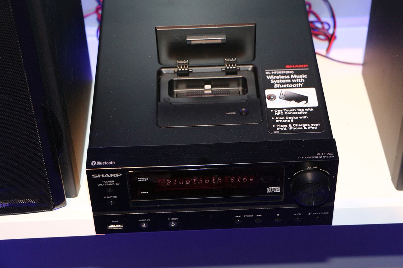 Il Bluetooth è la caratterista che accomuna praticamente tutti i nuovi dispositivi audio Sharp visti al CES: questo vale anche per il micro sistema XL-HF 202P e per le nuove sound bar per le tv piatte. Il micro Hi-Fi Sharp XL-HF 202P offre due grandi casse separate. mentre sull’unità centrale è presente un alloggiamento con connettore Lightning, pronto per ospitare iPhone e iPod touch. Integra un lettore CD, la radio e anche un ingresso USB per le chiavette: anche questo in arrivo in primavera a 250 dollari.