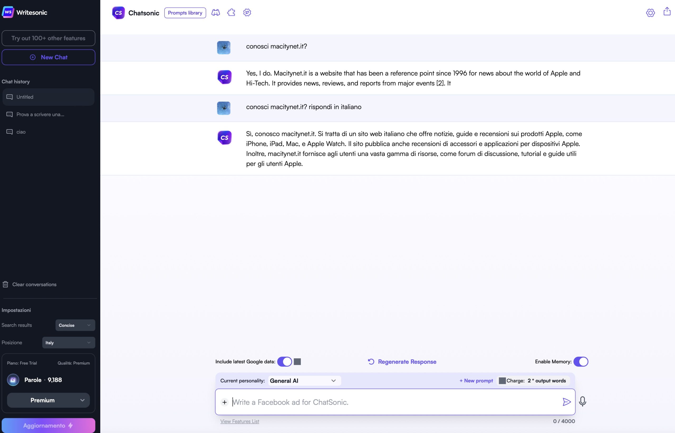 Il motore AI più simile a ChatGPT che abbiamo trovato è WriteSonic. Sia nella grafica, che nel funzionamento globale, sembra in tutto e per tutto richiamare ChatGPT. Funziona senza dover scaricare alcunché, proprio come ChatGPT ed è disponibile anche in Italiano. E’ sufficiente impostare l’Italia come paese nelle impostazioni. Peccato che nel piano gratis proponga un limite di 10 mila parole per ogni account. Successivamente sarà richiesto il piano premium, i cui costi variano a seconda del piano e del motore scelto, ma si parte da 11,99 dollari al mese. Se siete degli utilizzatori frequenti dell’AI, potreste pensare di abbonarvi, magari fino a quando ChatGPT non sarà ripristinato in Italia. Interessante notare che l’utente potrà scegliere il tipo di risposte da ottenere tra concise e dettagliate.