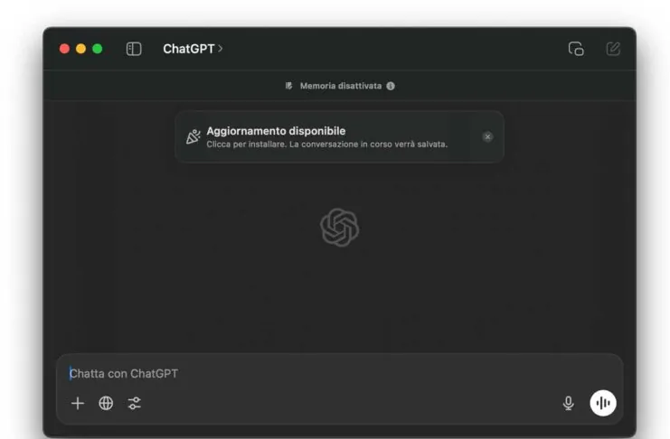 Se l’app ChatGPT è già installata sul vostro Mac potete aggiornala avviandola selezionando dal menu “ChatGPT” la voce “Verifica disponibilità aggiornamenti” e confermando l’installazione degli aggiornamenti proposti.