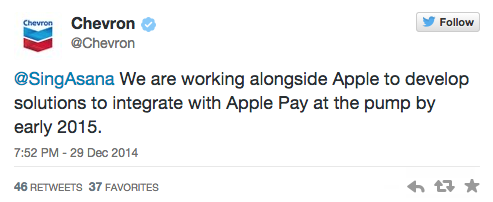 Nel 2015 si potrà fare il pieno all’automobile pagando con Apple Pay, almeno nei distributori Chevron. La nota compagnia petrolifera, infatti, ha in programma di integrare la tecnologia Apple Pay nelle proprie stazioni durante il prossimo anno. L’annuncio arriva direttamente dalla società, che ha chiarito l’intenzione attraverso il proprio canale twitter ufficiale.