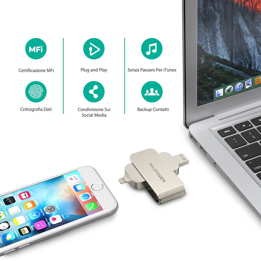 Esteticamente è simile a qualsiasi altra chiavetta USB. Ha infatti da un lato questo connettore, utile per collegarla ad un qualsiasi computer per trasferirvi all’interno foto, video, documenti e qualsiasi altro genere di file. Dall’altro capo c’è invece il connettore Lightning di Apple con certificazione MFI che si infila nella presa di iPhone e iPad e permette di leggere il contenuto della chiavetta attraverso l’apposita applicazione senza dover trasferire alcun file all’interno del dispositivo.