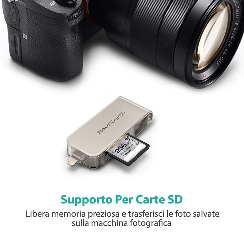 A differenza di altri prodotti simili, ormai molto comuni, questo accessorio d Ravpower offre anche un lettore di schede SD. In questo modo non solo si incrementa lo storage integrato, che può essere portato ad un totale di 320 GB (usando una SD da 256 GB), ma si otterrà la possibilità di salvare foto e video da e verso una comune macchina fotografica, che dispone di schede SD come memoria di archiviazione.