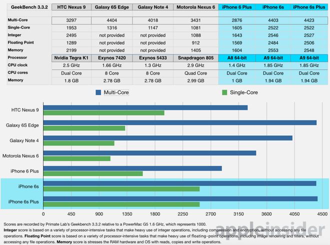 Rispetto allo scorso anno Apple ha fatto un bel passo in avanti quanto a processore: i nuovi iPhone 6s e iPhone 6s Plus ottengono punteggi Geekbench più veloci del 50% in multi-core e quasi del 60 per cento in operazioni che richiedono un singolo core. Si tratta, sulla carta, di numeri che superano quelli fatti registrare da Samsung e da Qualcomm, come suggerisce la redazione di appleinsider.
