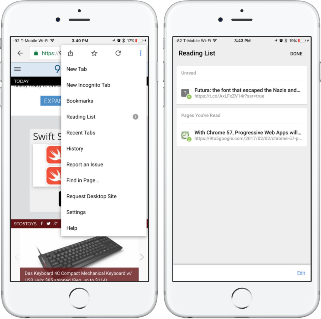 Anche l’ultima bea di Chrome per iOS, spiega il sito 9to5Mac, ora supporta una funzionalità simile permettendo agli utenti di questo browser di salvare gli articoli da leggere in seguito. Quando individuiamo un articolo di nostro interesse, basterà selezionare l’hamburger menù (l’icona con i tre punti in alto a destra) e scegliere “Elenco lettura” per aggiungere e rimuovere gli articoli di proprio interesse. L’elenco lettura separa gli articoli letti e da leggere, funzione che invece manca a Safari. Nel browser di Apple è ad ogni modo possibile scorrere verso sinistra per contrassegnare la pagina web come letta o per eliminarla dall’elenco di lettura.