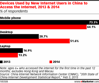 L’idea che gli smartphone, generalmente considerati il secondo schermo digitale in mercati internet sviluppati, siano in realtà il primo schermo per molti residenti dei mercati in via di sviluppo è abbastanza consolidata: secondo i dati del China Internet Network Information Center (CNNIC), il 73,3% delle persone in Cina che hanno utilizzato Internet per la prima volta nel 2013 ha avuto accesso tramite un telefono cellulare, contro il 28,7% che ha goduto di un accesso desktop.