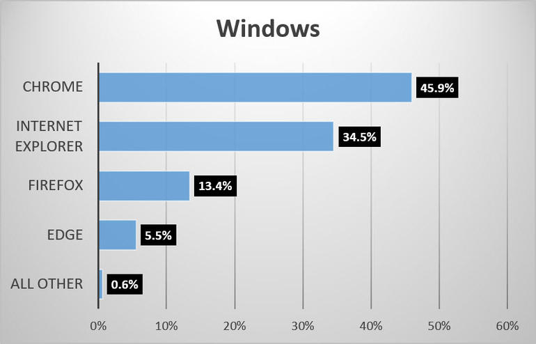 Su Windows, Chrome ha ormai superato Explorer: il browser di Google è usato dal 45.9% degli utenti, contro il 34.5% di Explorer. Firefox è al terzo posto con il 13.4%, seguito da 5.5%; altre soluzioni sono usate dallo 0.6%.