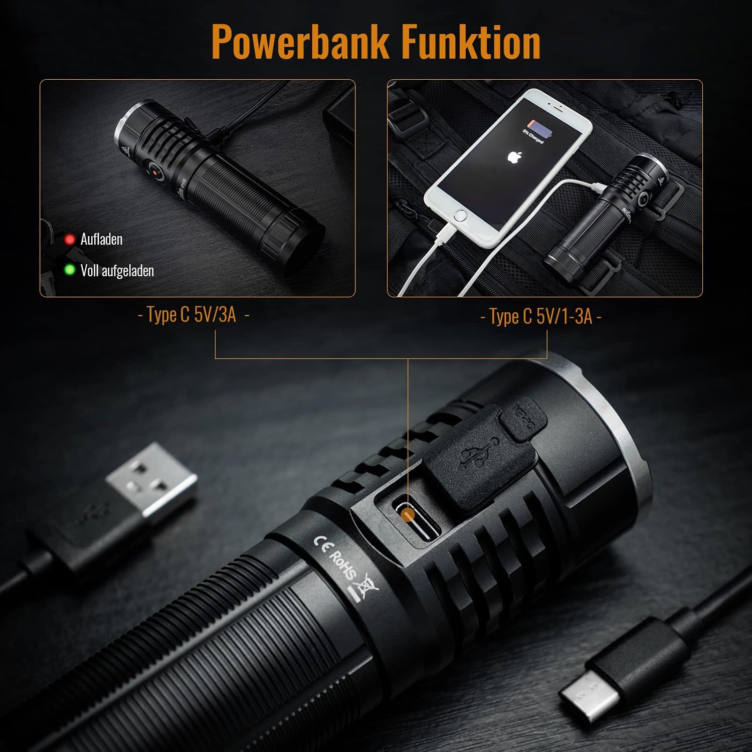 Questa torcia è ricaricabile tramite USB; è di piccole dimensioni e può stare in tasca. Secondo il produttore offre fino a 5000 lumen. È possibile selezionare 3 livelli di luce e sfruttare la funzione powerbank per ricaricare dispositivi (la batteria è da 5000mAh). Il corpo è in lega di alluminio e il vetro usato è temperato.