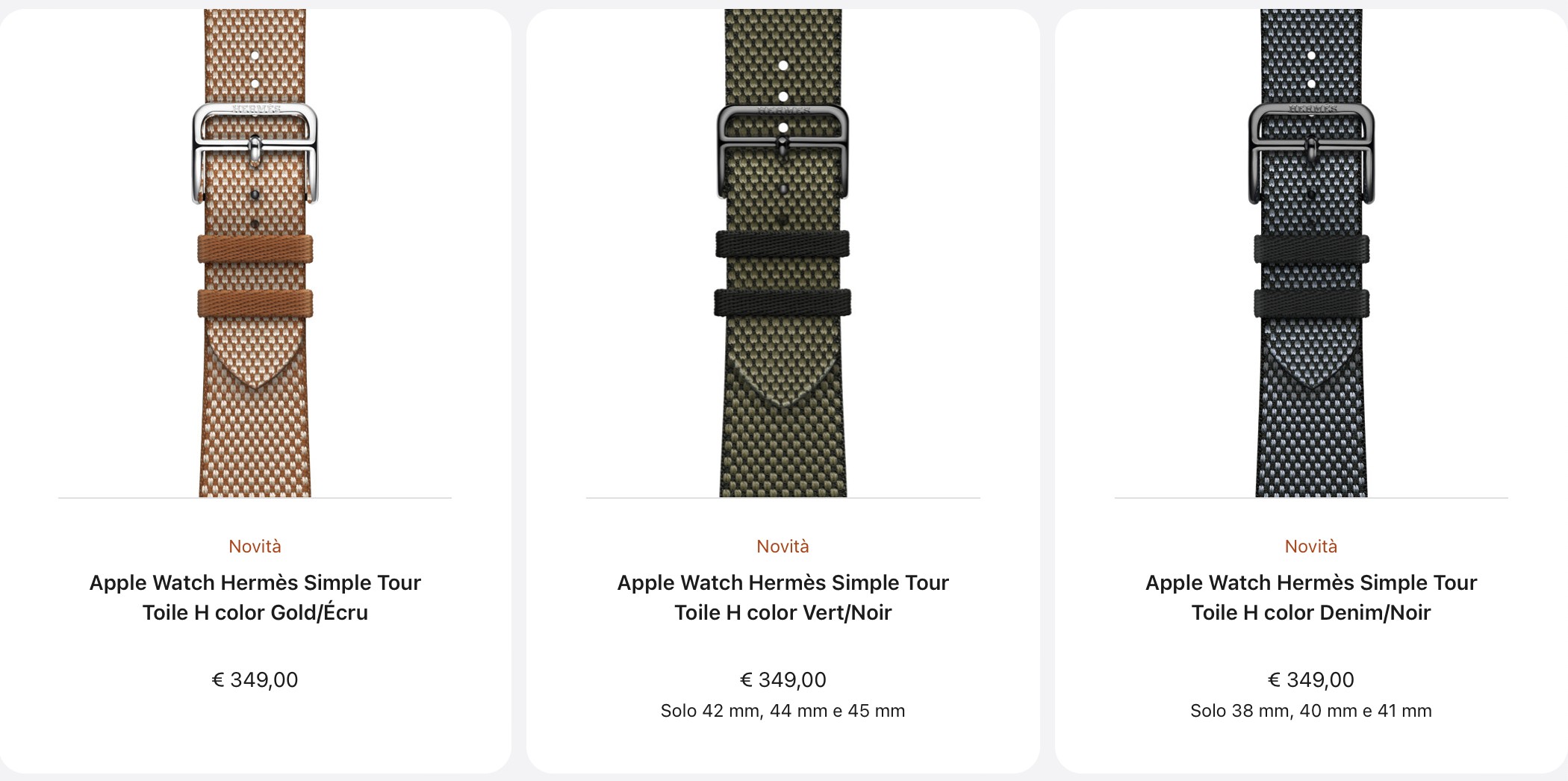 Il prezzo del solo cinturino è di 349 euro, disponibile in colori Gold/Écru, Bert/Noir, Denim/Noir.