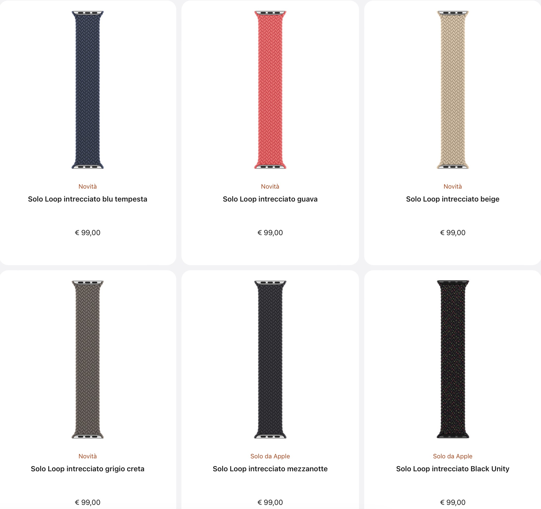 La serie Solo Loop intrecciato è una esclusiva Apple. Si tratta di cinturini con fibre elastiche, intrecciate con fili di silicone, senza fibbie né chiusure. I nuovi colori sono blu tempesta, Guava, beige, grigio e grigio creta.