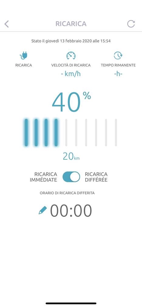 Dall’app si seleziona la scheda “Ricarica” e si possono visualizzare diverse informazioni: il livello di ricarica della batteria indicato in percentuale, l’autonomia rimanente espressa in chilometri, la velocità di ricarica (ovvero i km recuperati ogni ora), il tempo rimanente per il completamento della ricarica. Si può selezionare la ricarica immediata oppure differita. In questo secondo caso, verrà richiesto di impostare l’orario di inizio del processo di ricarica. Per beneficiare di tariffe più vantaggiose è possibile impostare l’inizio del processo di ricarica nelle ore notturne.