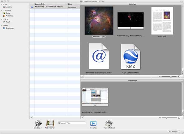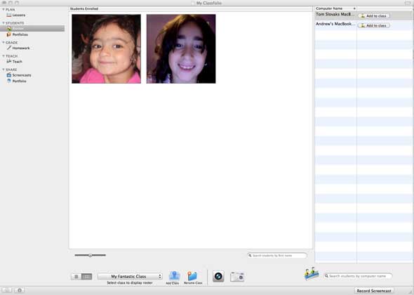 Classfolio è uno strumento per insegnanti che consente di importare e organizzare media di vario tipo in lezioni. Immaginate di avere una classe con cinquanta studenti: invece di utilizzare i computer degli studenti come strumenti passivi, è possibile trasformarli in elementi attivi, mostrando siti web, file PDF, fotografie, videate di Google Earth, filmati e altri documenti, tutti raccolti alla fine della lezione in un portfolio permanente con l’indicazione della data e degli studenti presenti. E’ possibile portare a termine le lezioni con un sistema di controllo remoto, proiettare file multimediali e trasferire file in tempo reale ai vari elementi della classe. E’ possibile registrare screencast delle lezioni e spedirle a casa degli studenti al termine della lezione o metterle a disposizione sul web. Tutto ciò senza bisogno di un server o di una complessa infrastruttura ma solo è soltanto appoggiandosi ad Apple Remote Desktop, il sistema di gestione desktop per Mac OS X che permette di gestire i computer sulla rete, creare rapporti e automatizzare i task.