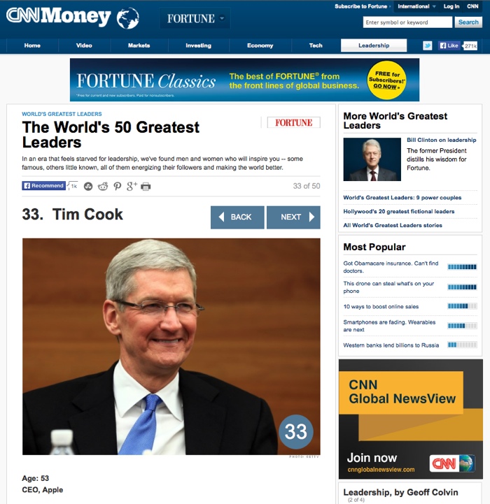 Tim Cook, Ceo di Apple è, ad esempio presente nella classifica Fortune dei 50 leader mondiali, in 33esima posizione. Pur rientrando nella graduatoria, il posizionamento non è particolarmente brillante: tra i protagonisti del mondo della tecnologia Cook è preceduto da Jeff Bezos, Ceo di Amazon al decimo posto, Jack Ma di Alibaba 16esimo e Zhang Ruimin, Ceo di Haier 22esimo.