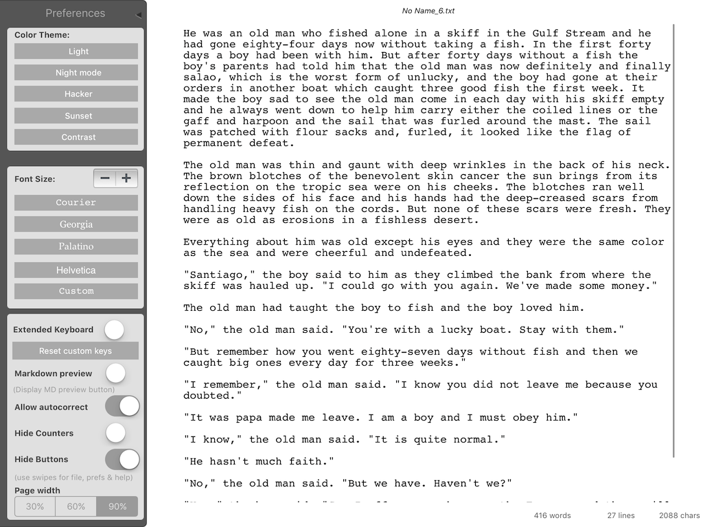 Tra le caratteristiche più interessanti della nuova versione la possibilità di contare le parole, i caratteri e le linee di testo. L’interfaccia è sempre minimalista e consente di nascondere i vari elementi, lasciando solo il testo vero e proprio in evidenza usando gesture multi-touch per richiamare funzioni e navigare tra i menu. Sono disponibili quattro “temi” per la scrittura notturna e diurna, funzioni per la scelta del font generale, per la gestione dei file con Dropbox, supporto per tastiere esterne con scorciatoie personalizzabili, funzioni per spedire file via email.