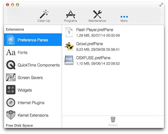Oltre a funzionare come utility per la disinstallazione completa delle applicazioni, CleanApp permette di eseguire routine di manutenzione ordinaria sul filesystem, riparare permessi, eseguire script di manutenzione, ricostruire l’indice Spotlight. Sono presenti anche opzioni per eliminare lingue aggiuntive nei programmi, font, componenti QuickTime, salvaschermo, widget, plug-in per internet, estensioni del kernel, Preferenze di Sistema.
