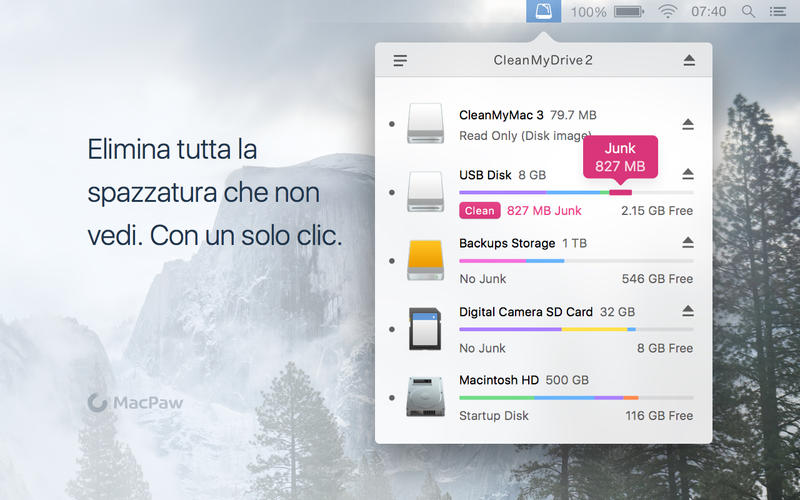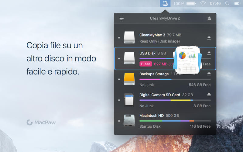 CleanMyDrive è un disk manager per unità esterne e interne, che permette di accedere rapidamente a qualsiasi unità con informazioni dettagliate sull’utilizzo dello spazio; con la versione appena rilasciata su Mac App Store, che prende il nome di CleanMyDrive 2, è possibile visualizzare facilmente le statistiche utilizzo del disco, pulire file spazzatura nascosta con un clic, copiare istantaneamente file su qualsiasi disco ed espellere rapidamente i dischi esterni direttamente dalla barra menu, con un solo click sull’icona di espulsione.