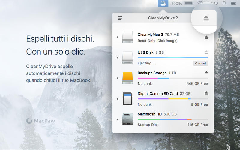 CleanMyDrive 2 ora espelle automaticamente i dischi quando il sistema va in stop per mantenere al sicuro i dati, mostrando le notifiche quando i dischi vengono collegati o espulsi; è possibile anche espellere tutti i dischi con un’unica azione e all’occorrenza nascondere i dischi dalla lista, in modo da non mostrarne alcuni in particolare.