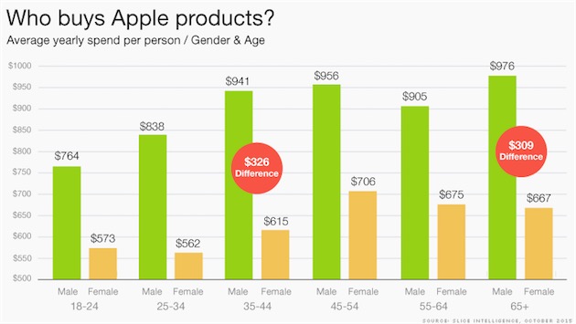 Dai dati emerge che gli uomini acquistano prodotti Apple di più rispetto alle donne. Gli uomini hanno speso mediamente 897$, mentre le donne 633$. Con il crescere dell’età si spende mediamente di più; le donne tra i 18 e i 24 anni, spendono meno di tutte: mediamente 669$ lo scorso anno.