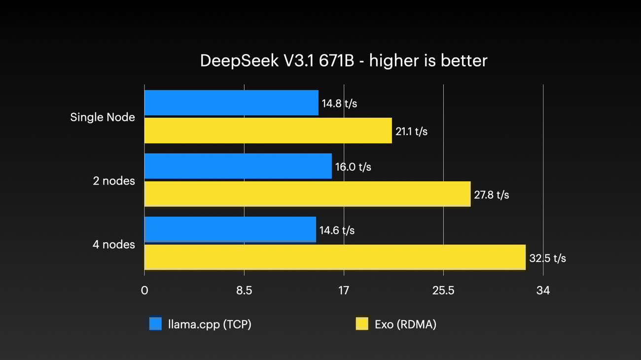 Un video su YouTube spiega che il Mac Studio M3 Ultra già da solo offre prestazioni eccellenti con i calcoli legati all’IA, con un’efficienza migliore rispetto ai dispositivi usati inquina questo ambito e basati sui chip Nvidia e AMD. Collegando i quattro Mac Studio in Ethernet a 2,5 Gb/s e usando il protocollo IP over Thunderbolt, il cluster con i quatto Mac Studio offre guadagni interessanti, con la tecnologia Thunderbolt che mostra evidenti vantaggi rispetto all’Ethernet, grazie a una latenza più bassa