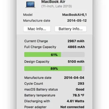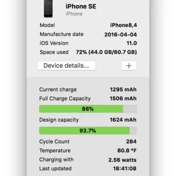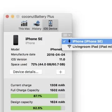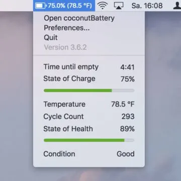 coconut Battery 3.9 è l’ultima versione di una comoda utility che consente di ottenere vari dettagli sullo stato di salute della batteria di Mac e dispositivi iOS (iPhone, iPad, iPod touch). È possibile ottenere dettagli quali la data di costruzione della batteria, il numero di cicli, la temperatura, lo stato, l’età e altro ancora.