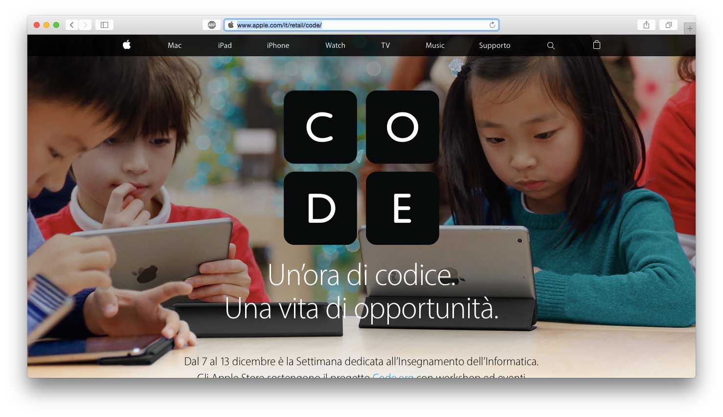 Dal 7 al 13 dicembre è la settimana dedicata all’insegnamento dell’informatica a cui partecipano anche Apple e gli Apple Store, in sostengno del progetto Code.org con workshop ed eventi speciali per bambini dai 6 anni in su.