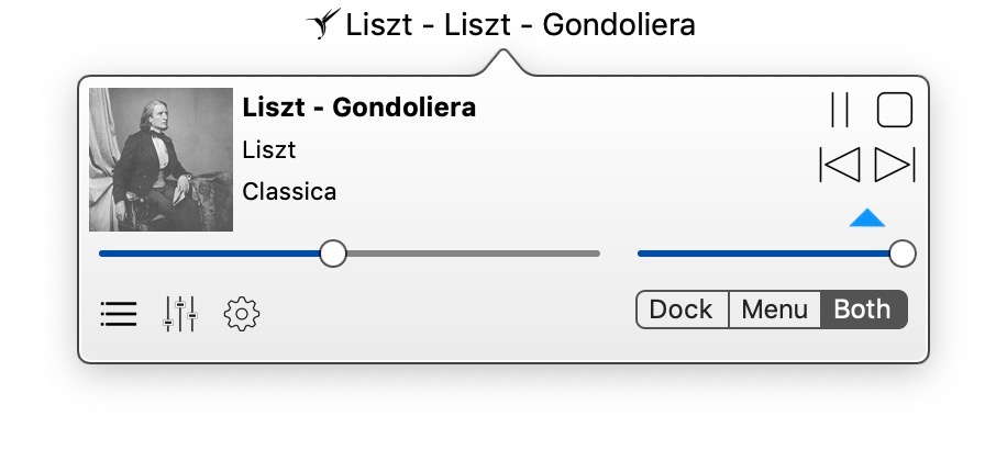 L’app volendo si integra anche nella barra dei menu spuntando l’apposita voce. A quel punto gli verrà dedicato uno spazio di 40 caratteri (anche questo regolabile a piacere) per mostrare l’autore e il brano in riproduzione, oppure solo una di queste due informazioni.