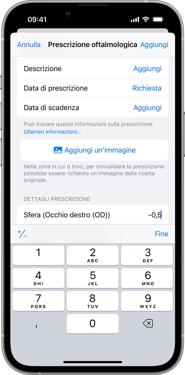 Apple spiega che le prescrizioni oftalmologiche possono variare e non tutti i Paesi o le aree geografiche richiedono gli stessi campi o le stesse misurazioni. Se decidiamo di aggiungere manualmente una prescrizione oftalmologica, bisogna solo aggiungere le informazioni specifiche per la prescrizione del proprio paese o della propria area geografica.