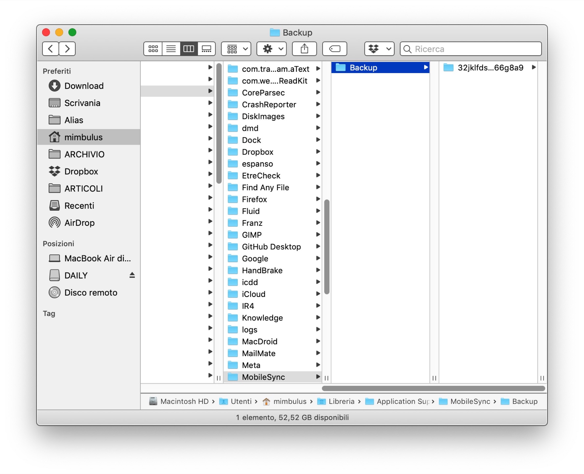 Ci siamo quasi. Trovare la cartella dei backup infatti è il penultimo passo: adesso dovete semplicemente copiarla dentro un disco esterno. Collegato quindi al Mac, poi: