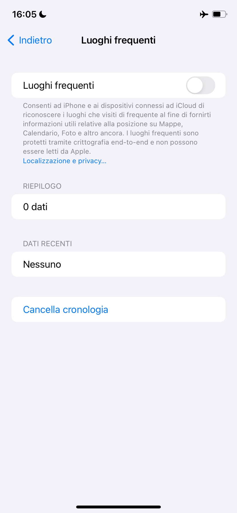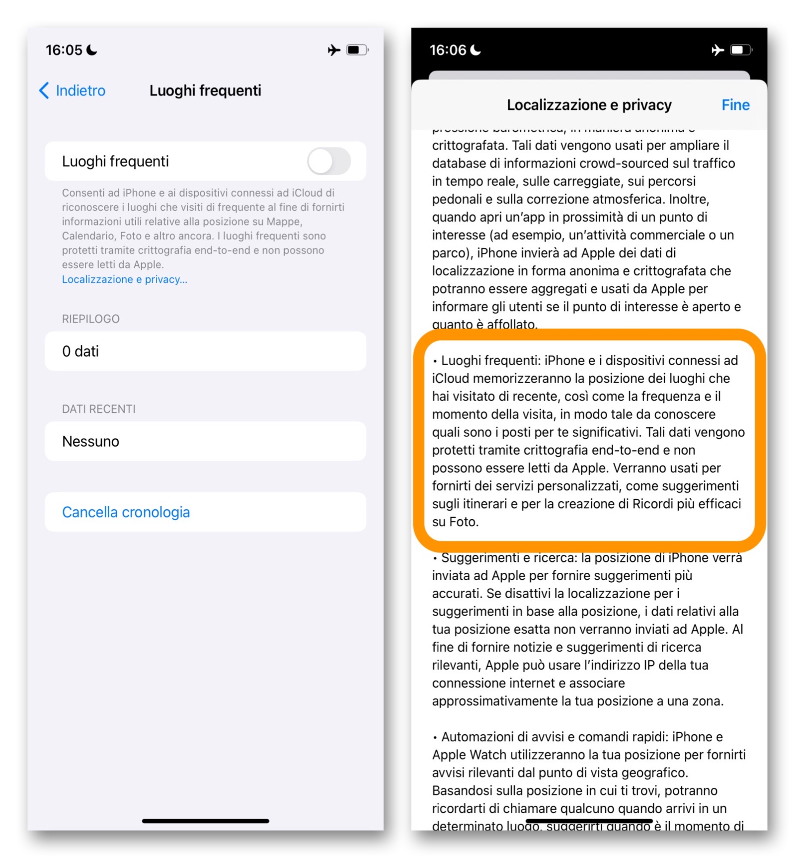 Luoghi frequenti: iPhone e i dispositivi connessi ad iCloud memorizzeranno la posizione dei luoghi che hai visitato di recente, così come la frequenza e il momento della visita, in modo tale da conoscere quali sono i posti per te significativi. Tali dati vengono protetti tramite crittografia end‑to‑end e non possono essere letti da Apple. Verranno usati per fornirti dei servizi personalizzati, come suggerimenti sugli itinerari e per la creazione di Ricordi più efficaci su Foto.