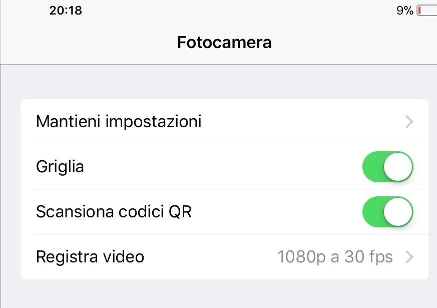 Per abilitare la livella è sufficiente recarsi all’interno di Impostazioni, Camera e, infine, attivare l’interruttore griglia.