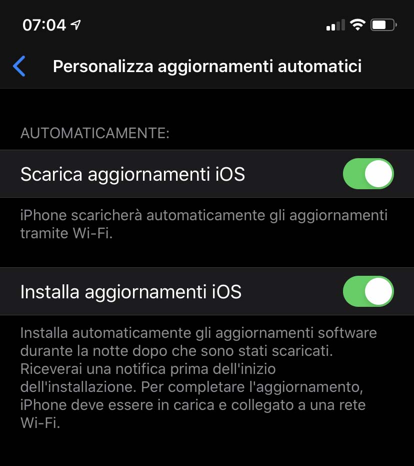 A partire da iOS 13.6 e iPadOS 13.6 Apple ha integrato nuova funzionalità nella sezione Generali > Aggiornamenti software > Personalizza aggiornamenti automatici, offrendo due opzioni: “Scarica aggiornamenti iOS” (iPhone scaricherà automaticamente gli aggiornamenti tranite Wi-Fi) e “Installa aggiornamenti iOS” (installa automaticamente gli aggiornamenti durante la notte dopo che sono stati scaricati); con la seconda opzione, l’utente riceve una notifica prima dell’inizio dell’installazione e per completare l’aggiornamento il dispositivo deve essere in carica e collegato a una rete Wi-Fi.