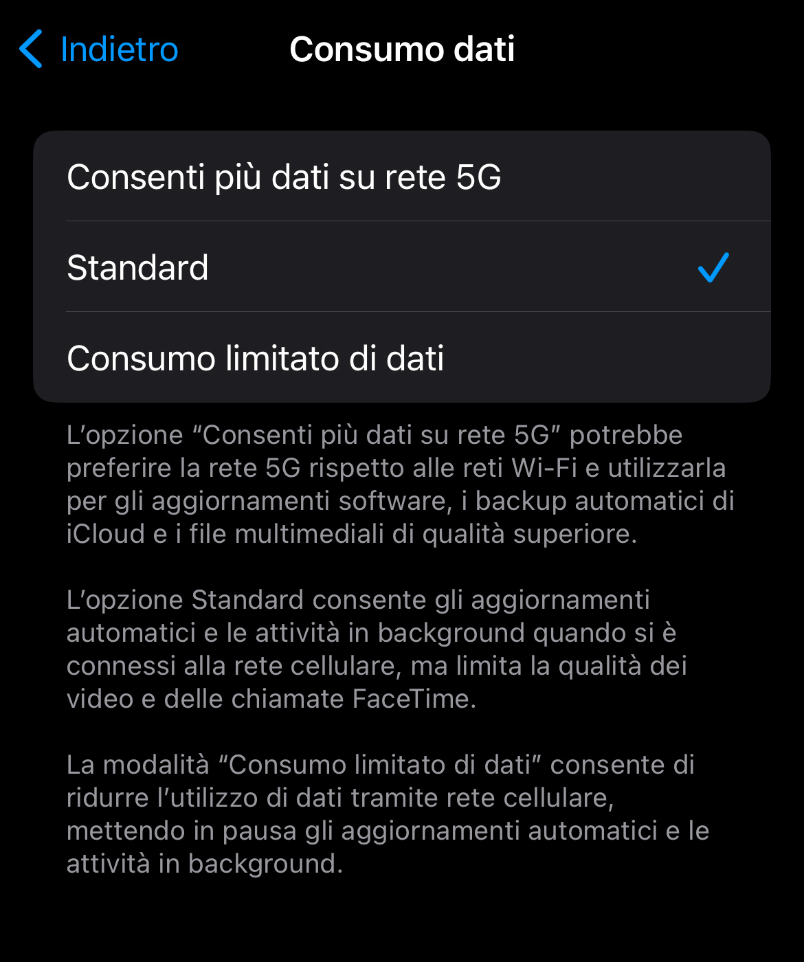 È possibile attivare l’opzione Consumo limitato di dati separatamente per la rete cellulare e Wi-Fi. Le impostazioni dell’opzione Consumo limitato di dati potrebbero variare a seconda dell’operatore telefonico; basta ad ogni modo andare su Impostazioni > Cellulare, selezionarne “Opzioni dati cellulare” e da qui la sezione “Consumo dati”.
