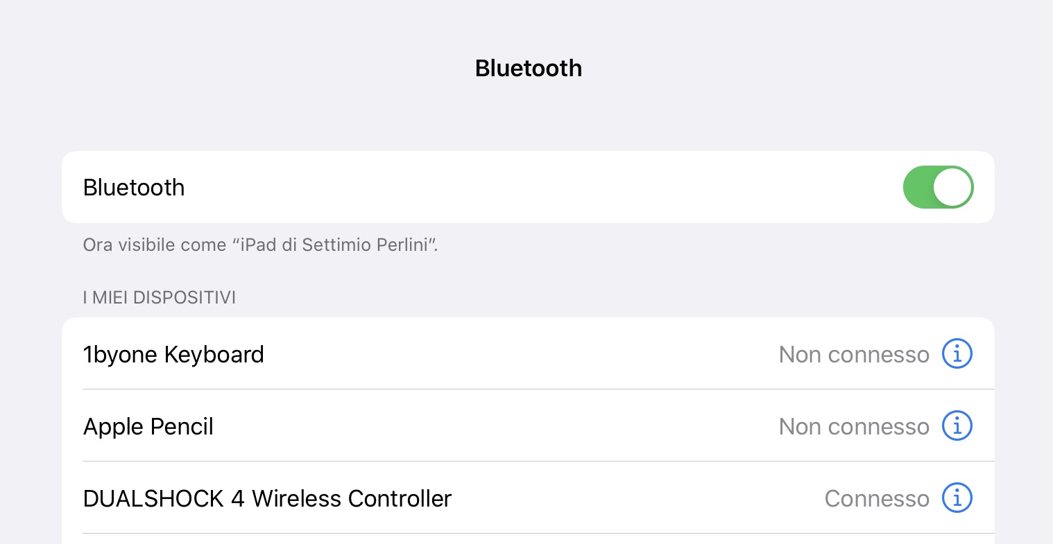 Dall’altra parte andate su impostazioni e sul controllo Bluetooth di iPhone e iPad o nel menu telecomandi di Apple TV o sul simbolo Bluetooth di macOS Catalina nel menu in alto e attivate la connessione Bluetooth e infine la ricerca del pad da colllegare.