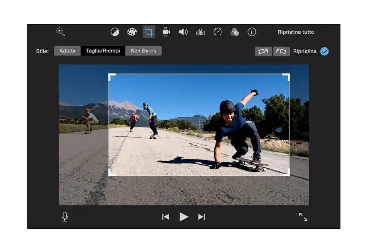 Se aggiungete un video a definizione standard in formato 4:3 a un progetto in formato 16:9, iMovie ritaglia automaticamente il video per adattarlo all’intero fotogramma in formato 16:9. È possibile ripristinare il fotogramma originale in formato 4:3 del clip selezionando il clip, mostrando i controlli di ritaglio, facendo clic sul pulsante Ritaglio e scegliendo Adatta. Se ripristiniamo un clip che utilizza il formato 4:3, a sinistra e a destra del clip vengono visualizzate delle barre nere.