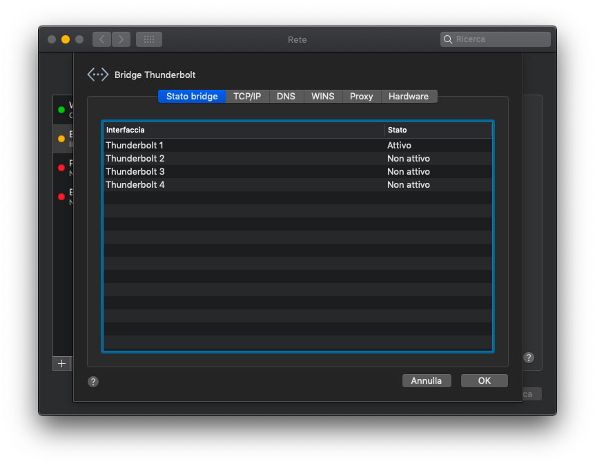La tecnologia Thunderbolt 3 è 8 volte più veloce di USB 3.0 e offre una larghezza di banda sufficiente per gestire ogni cosa. Di seguito il test che abbiamo eseguito su un Mac mini 2018 e un MacBook Pro 13″ 2017. Abbiamo collegato i due dispositivi con un cavo Thunderbolt, aperto le Preferenze di Sistema, cliccato su “Rete”, selezionato “Bridge Thunderbolt” nell’elenco a sinistra. Facendo click Fai clic su Avanzate, è possibile inserire parametri quali DNS e cercare gli indirizzi del dominio se la rete li richiede.