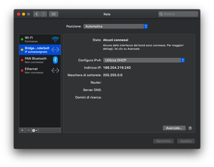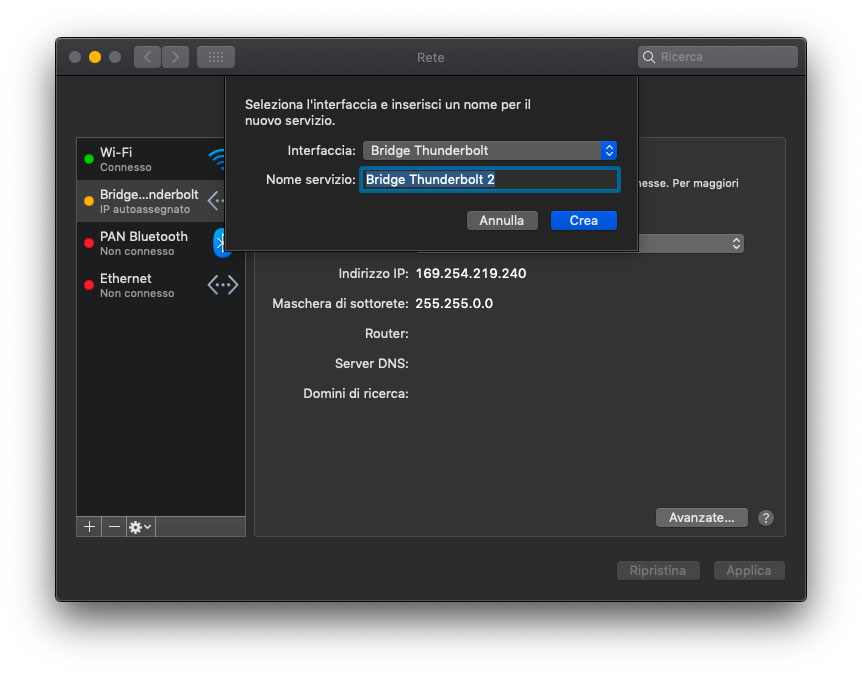 Collegando i computer utilizzando IP su Thunderbolt, di default, i computer ricevono gli indirizzi IP tramite DHCP. Per inserire manualmente un indirizzo IP o selezionare un’altra modalità di ricezione di un indirizzo IP, basta usare il menu a comparsa Configura nella sezione “Rete” delle preferenze di sistema.
