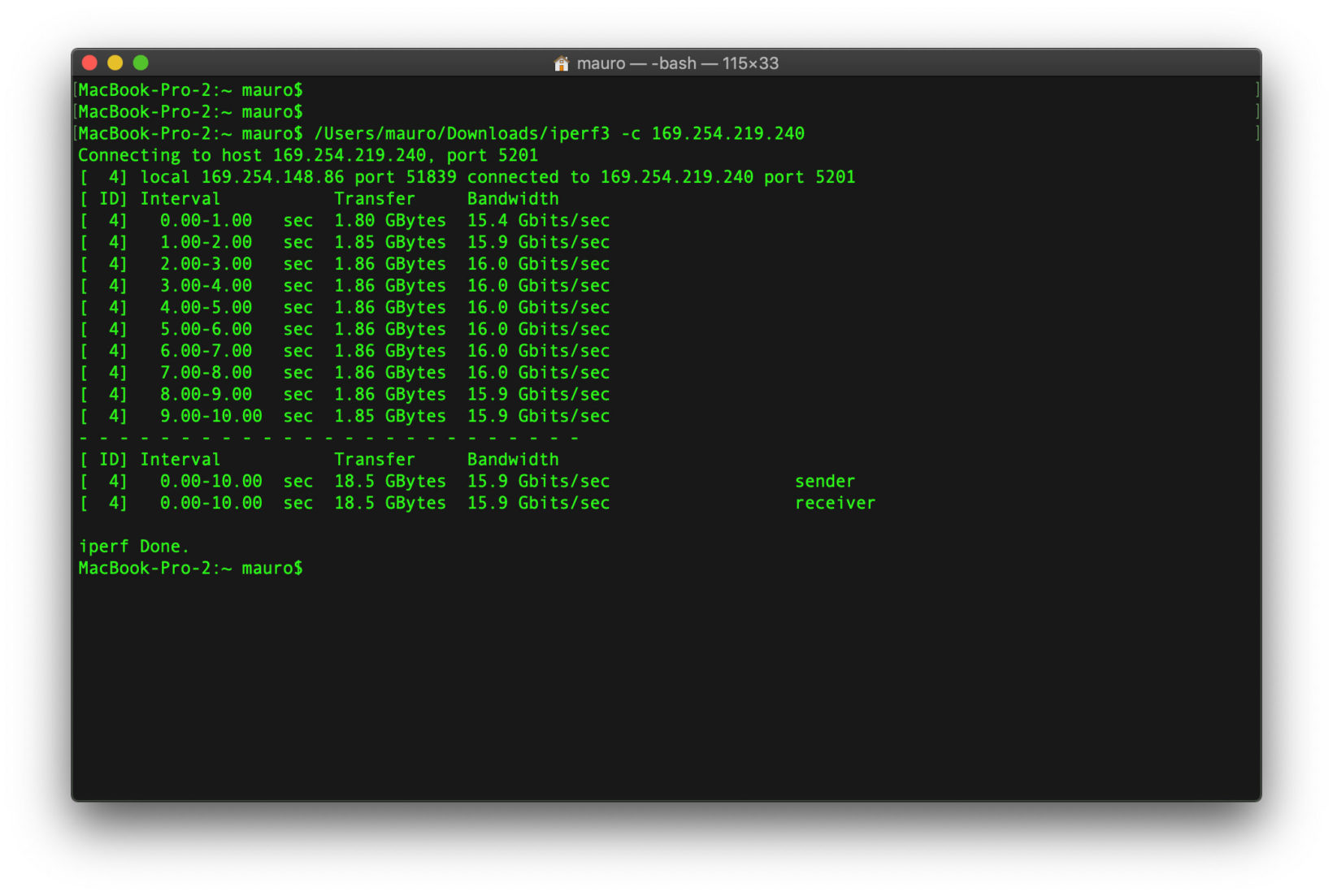 Per capire a quale velocità avviene il trasferimento dei dati, abbiamo usato l’uitlity iPerf, strumento specifico per misurare la larghezza di banda. Di seguito i risultati ottenuti che in pratica consentono di arrivare al massimo teorico consentito.
