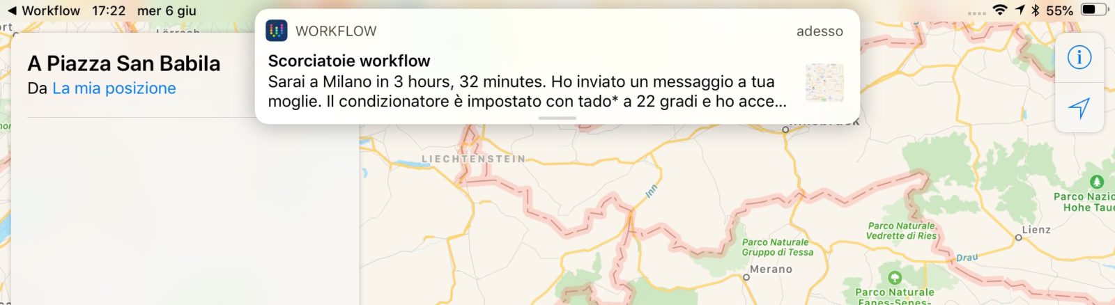 Selezionando Done si avrà una Scorciatoia Siri simile a quella indicata alla WWDC da abbinare ad esempio al comando “parto per casa” che attiverà il calcolo della distanza da casa e il relativo tempo di percorrenza, l’invio del relativo messaggio, l’accensione delle luci, la regolazione del condizionatore e l’avvio della vostra playlist preferita sul vostro telefono in auto… tutto con un solo comando vocale.