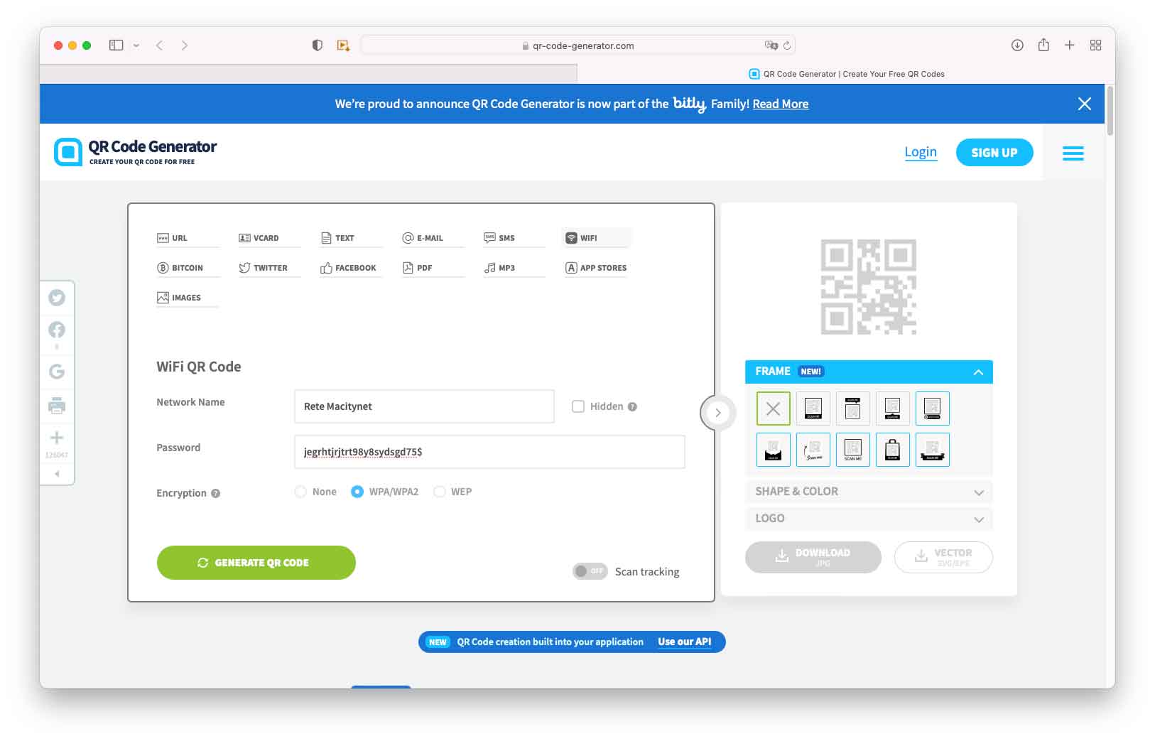 Esistono vari siti internet che consentono di generare codici QR. Noi abbiamo usato QR Code Generator, un sito che consente di generare codici QR di vario tipo. Per il collegamento con la rete WiFi fate click su “WiFI”, indicate in modo preciso il nome dell’SSID (il nome della rete wireless), la relativa password di accesso e la tipologia di cifratura (nessuna, WPA/WPA2 o WEP); dopo avere indicato i dati essenziali, fate click su “Generate QR Code”: otterrete il QR code che sarà possibile scaricare (anche in formato vettoriale) e stampare. Il codice ottenuto è personalizzabile in vari modi, includendo anche un eventuale logo.