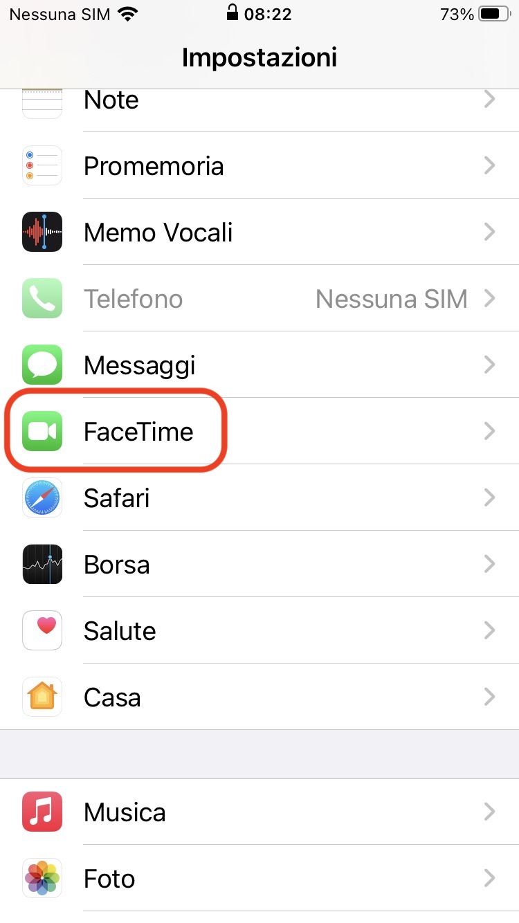 • Scorrete verso il basso fino alla voce “FaceTime”, quindi selezionatela