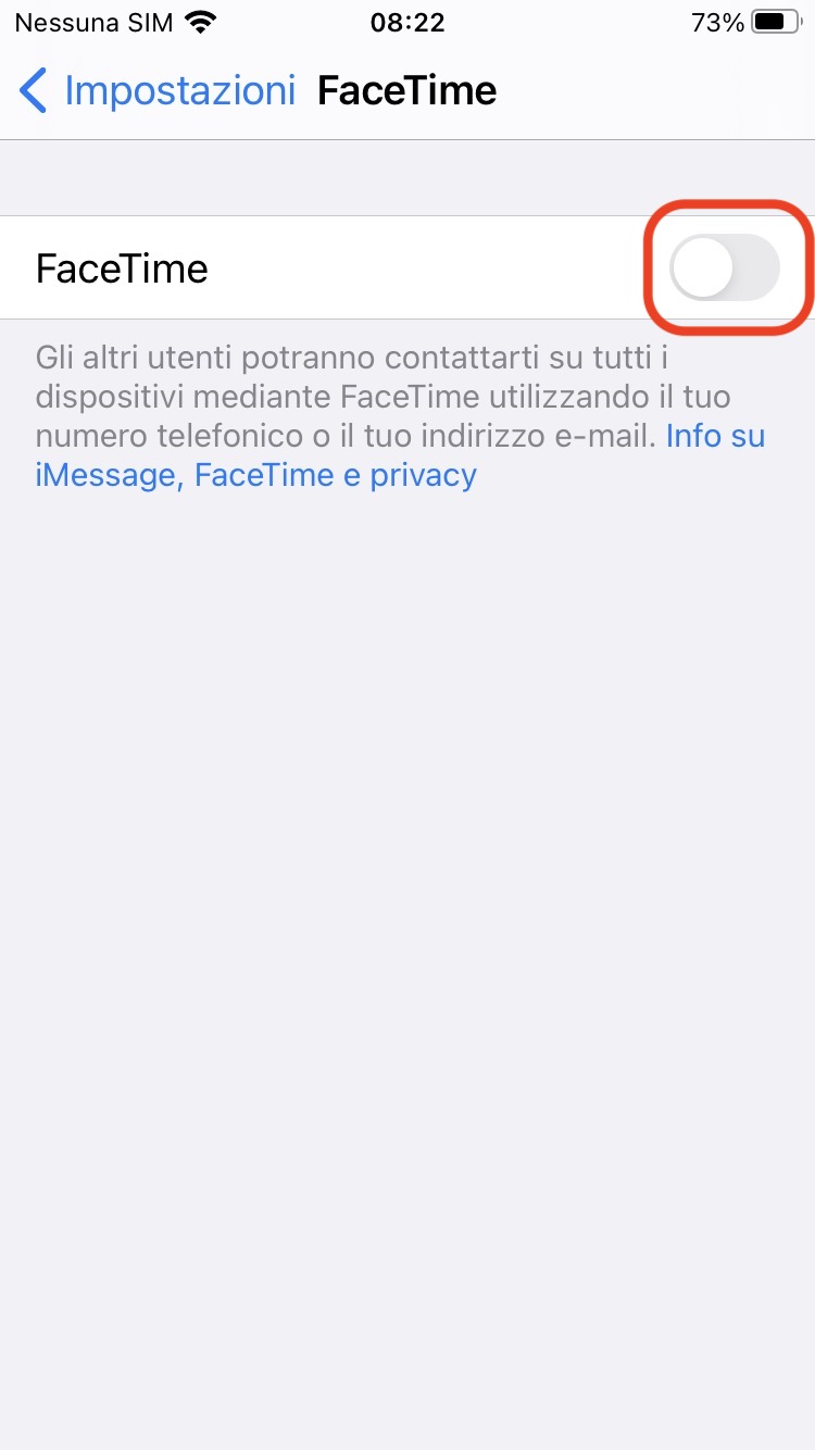 • All’interno della nuova scheda, spegnete l’interruttore sulla voce “FaceTime”