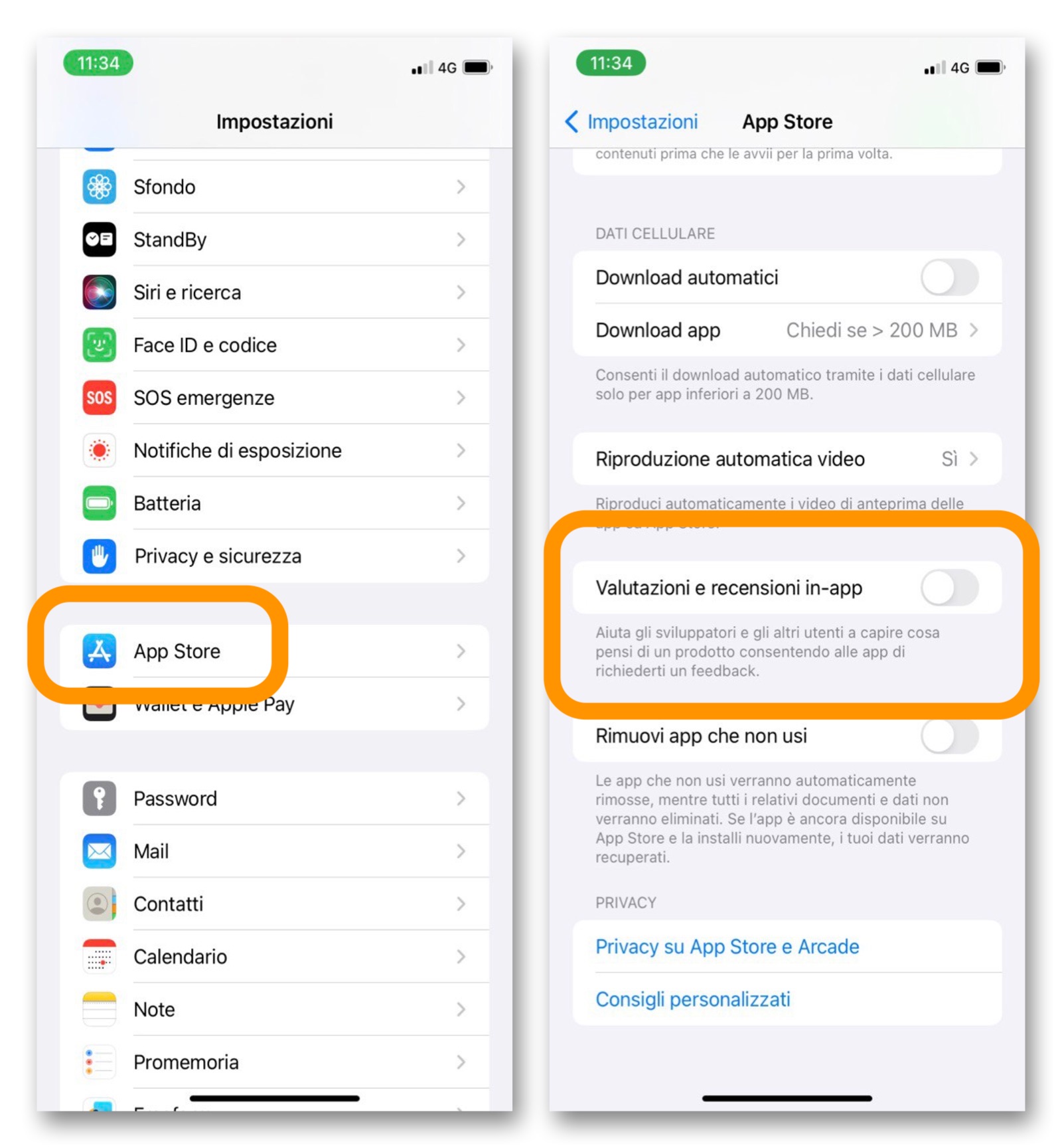 Tutto quello che dovete fare è aprire l’app Impostazioni del telefono, quindi scendere in basso fino a raggiungere la scheda App Store. Apritela, quindi spegnete l’interruttore alla voce Valutazioni e recensioni in-app.
