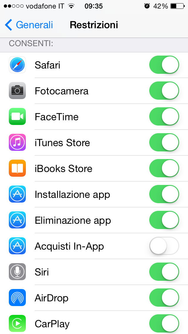 Dopo aver abilitato le restrizioni, di default il sistema lascia attive tutte le opzioni. Nel caso in cui voleste proprio disabilitare totalmente gli acquisti in-app (come ha fatto chi scrive), vi basterà semplicemente disattivare l’interruttore Acquisti In-App nella lista delle applicazioni ed operazioni consentite. Questo disattiverà completamente la possibilità di acquistare oggetti e servizi aggiuntivi all’interno di qualsiasi applicazione. Ma se volessimo invece poterne effettuare saltuariamente qualcuno?