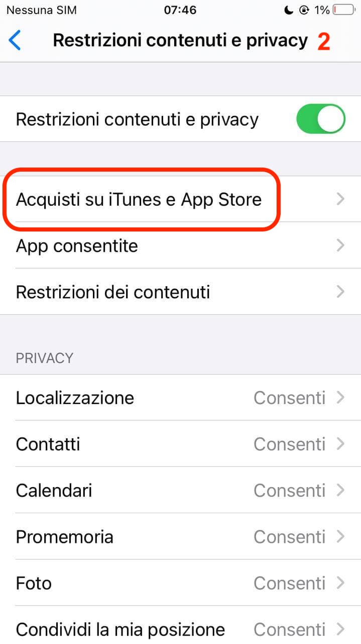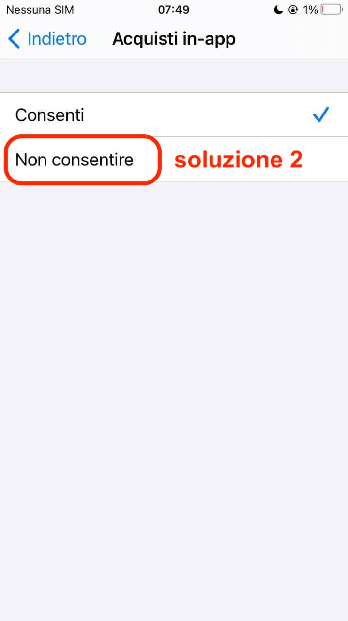 In alternativa potete anche disattivare completamente gli acquisti in-app. Da questa sezione, cliccate su “Acquisti in-app” e, anziché “Consenti”, spostate il selettore sulla voce “Non consentire”. Così facendo da questo dispositivo si potrà soltanto comprare applicazioni e non contenuti al suo interno.