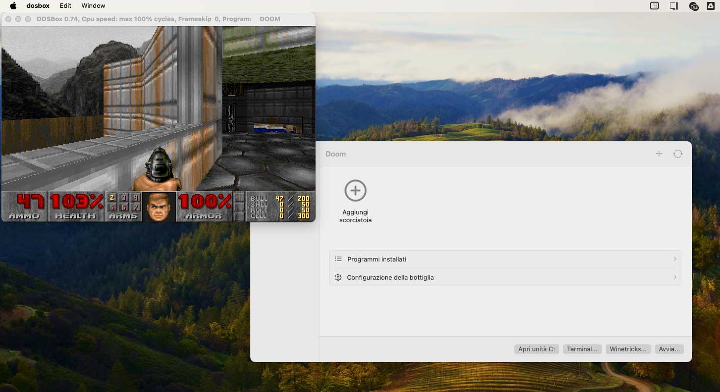 Il primo gioco che abbiamo provato su un Mac mini con M2 e 8GB di memoria RAM a eseguire è “The Ultimate DOOM” Abbiamo scaricato un pacchetto con il gioco, copiato i file di installazione in una cartella (del disco “C:), avviato il setup e al termine, avviato il gioco con un click su “Avvia”. La versione di Doom che abbiamo eseguito non era specifica per Windows ma una vecchia versione per MS-DOS ma ha funzionato correttamente, con l’unico limite che non è stato possibile eseguirlo a schermo intero.