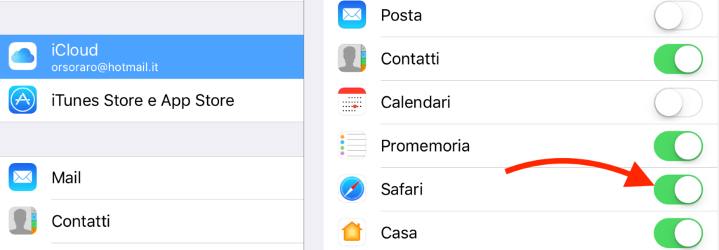 Per poter condividere i siti Preferiti tra dispositivi iOS e MacOS è necessario attivare la relativa opzione sia su iPhone/iPad, sia su Mac o PC. Sul versante mobile è sufficiente accedere al menù Impostazioni, cliccare sulla voce iCloud e, successivamente, attivare l’interruttore Safari.