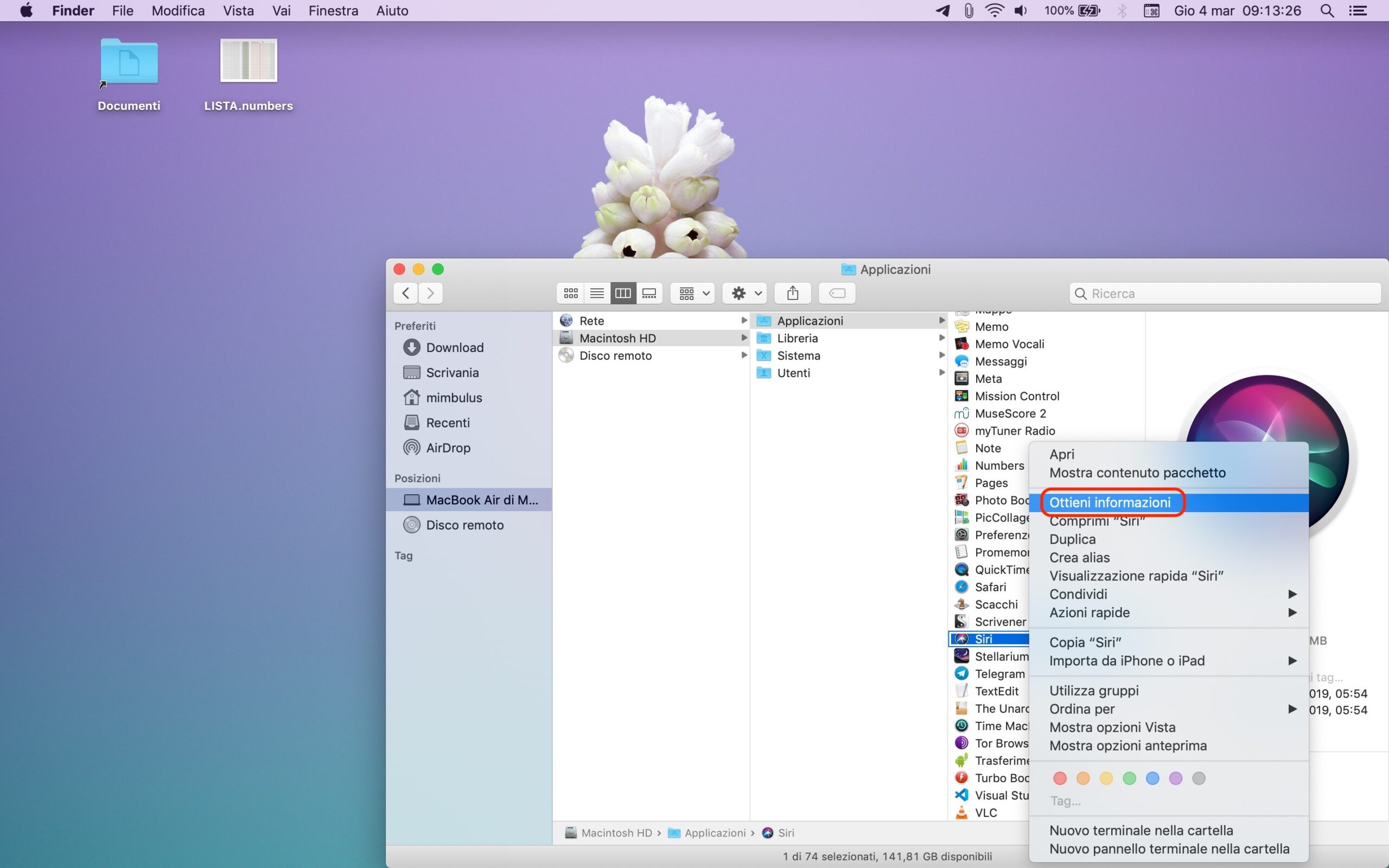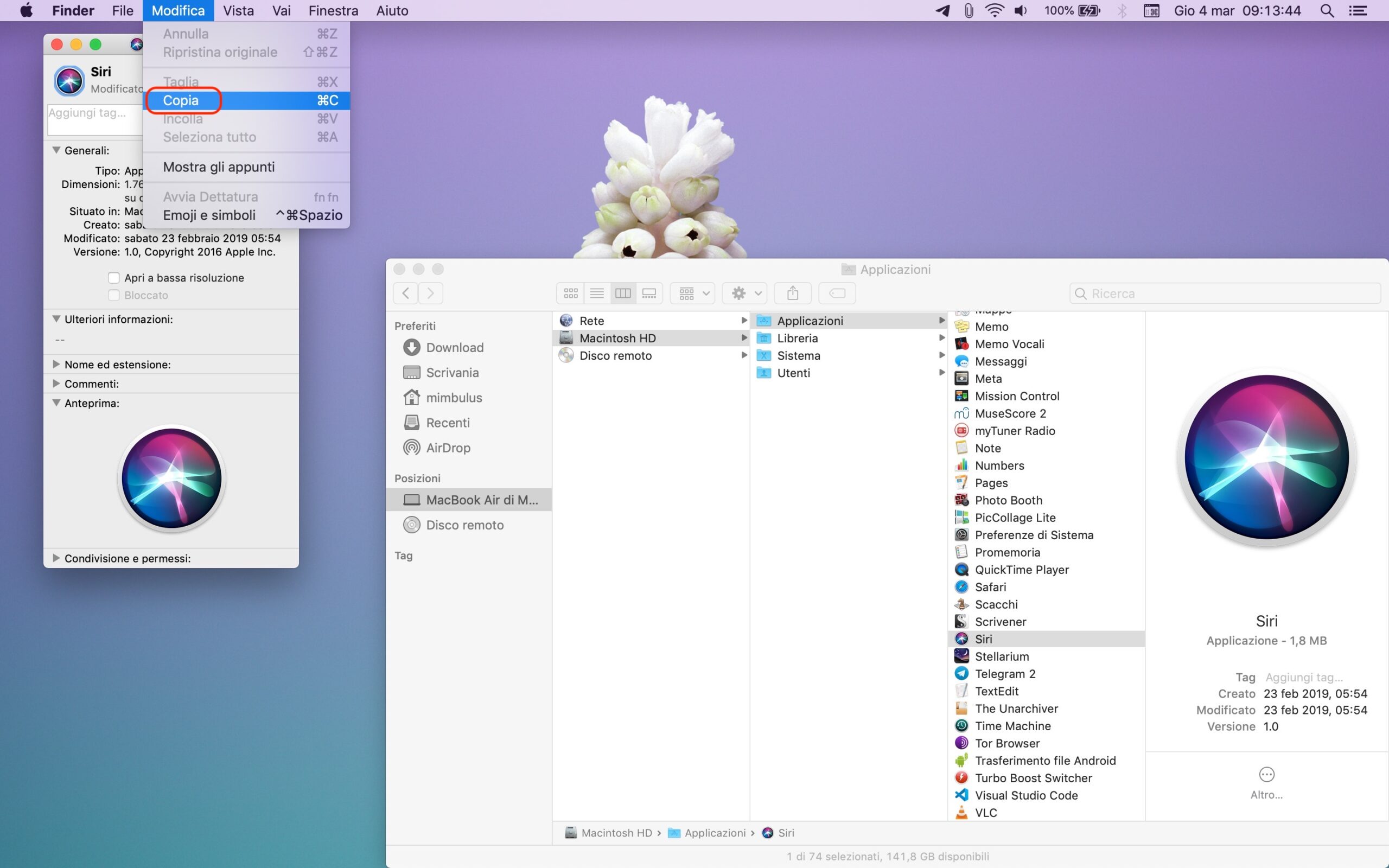 La prima cosa da fare è recarsi nella cartella “Applicazioni”, quindi cliccare con il tasto destro del mouse sopra l’icona dell’app desiderata e selezionare l’opzione “Ottieni informazioni”. Nella schermata che si aprirà è presente una piccola icona in alto a sinistra: è sufficiente selezionarla, quindi cliccare su “Modifica > Copia” nella barra di stato o, in alternativa, pigiare la combinazione Command + C sulla tastiera.