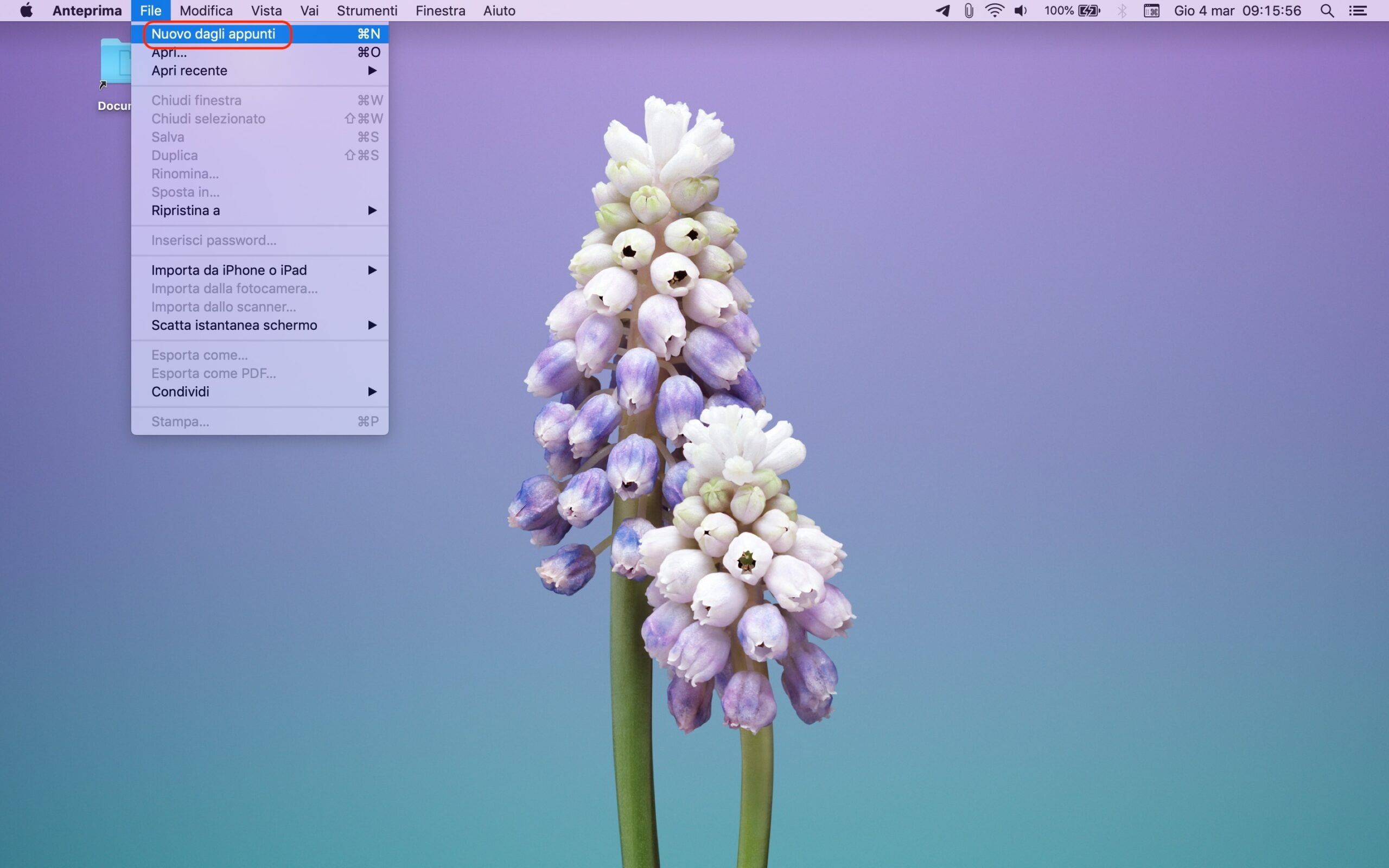 Fatto questo bisogna avviare l’app “Anteprima”, cercandola con lo Spotlight o direttamente dalla medesima cartella “Applicazioni”. Dalla barra di stato, cliccare su “File > Nuovo dagli appunti” oppure schiacciare la combinazione di tasti Command + N.