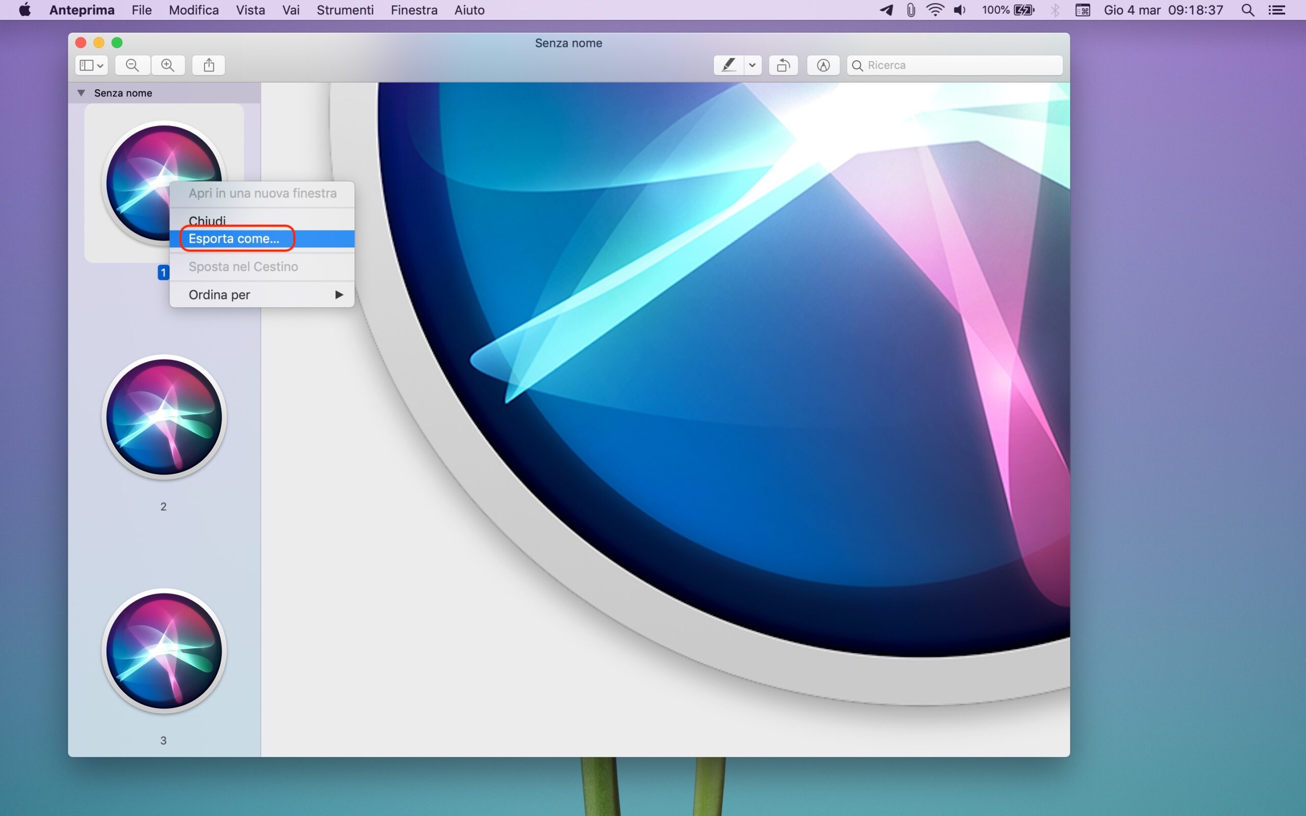 Si aprirà una nuova finestra contenente varie versioni dell’icona dell’applicazione precedentemente copiata negli appunti del Mac. La numero “1” è quella con le dimensioni maggiori (1.024 x 1.024 pixel): via via che si scorrono le varie miniature a lato si riduce la risoluzione. Non resta che cliccare con il tasto destro del mouse sopra l’icona più grande, la numero “1” appunto, e selezionare la voce “Esporta come…”.