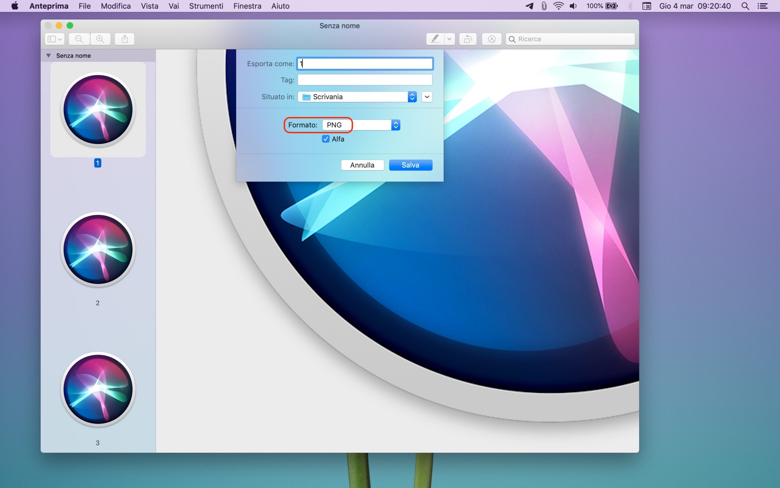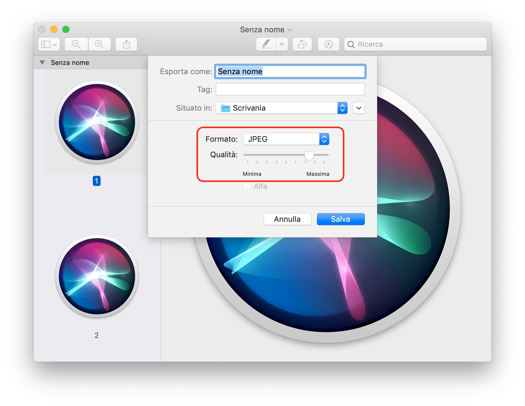 Tutto dipende da ciò di cui avete bisogno. In ogni caso, fatta la propria scelta, non resta che selezionare la cartella nel quale salvare l’immagine e cliccare sul tasto “Salva”. Poi si può anche chiudere la finestra di “Anteprima” contenete le icone dell’app cliccando sul pulsante “Elimina” in modo da non conservare il documento.